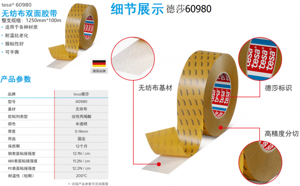 泡棉基材雙面膠具有柔軟、貼服性好、初粘性和持粘性好,抗溶劑性和抗紫外線好,一般厚度為0.4-1.0MM,短期耐溫130-150℃,長期耐溫80-93℃,適用于空調(diào)器、辦公家具、通訊產(chǎn)品的粘接,可代替螺絲固定設(shè)計,使產(chǎn)品更美觀。