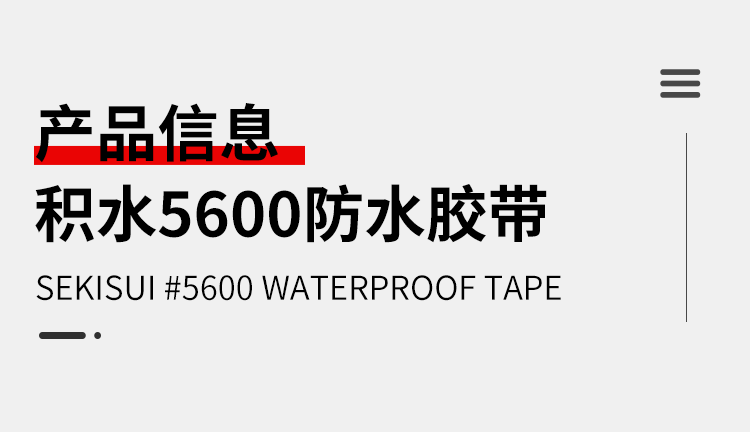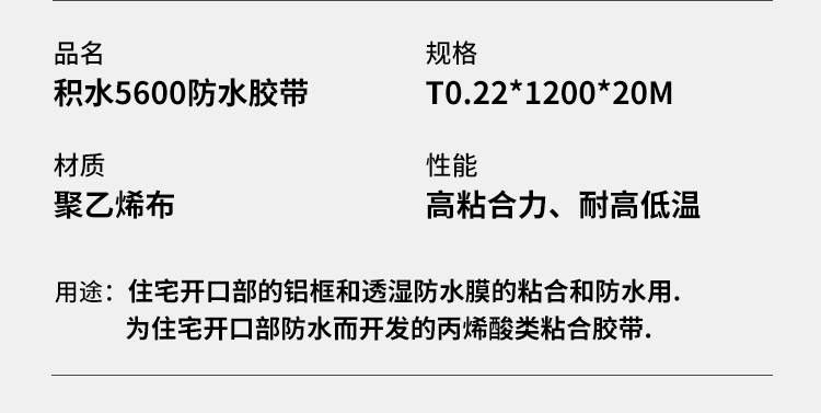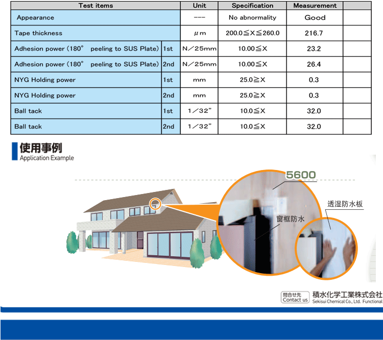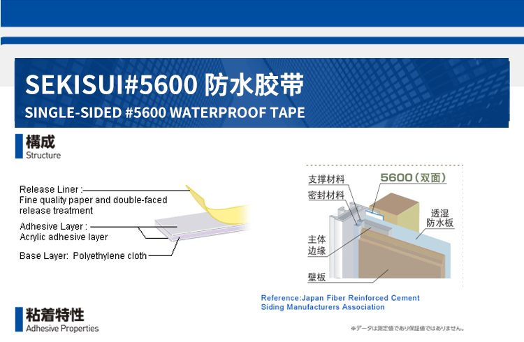1.防水膠帶#5600是為住宅開(kāi)口部防水而開(kāi)發(fā)的丙烯酸類粘合劑膠帶。與以往的瀝青類、丁基合成橡膠類相 比,可大幅提高密封的可靠性,實(shí)現(xiàn)無(wú)污垢作業(yè)環(huán)境。